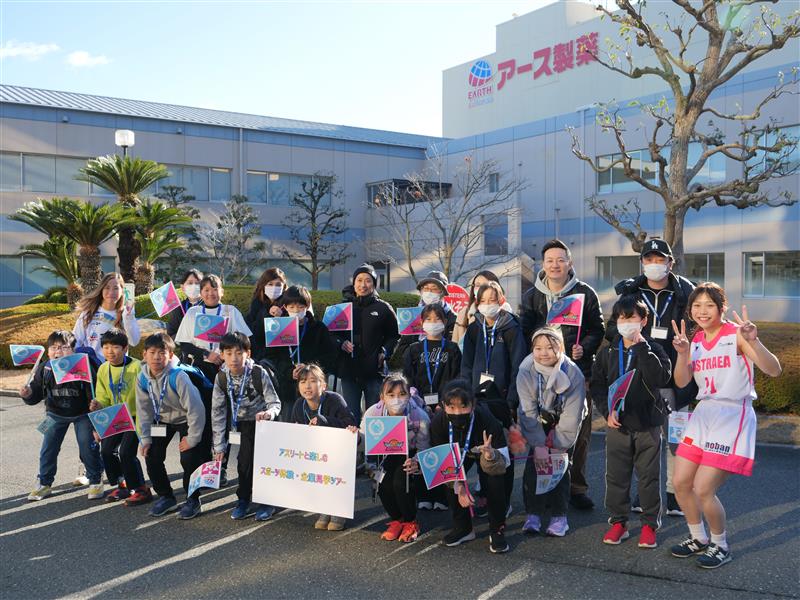 小学生13名と保護者7名の計20名が参加し、両クラブの選手たちと一緒にアース製薬株式会社の施設見学とスポーツ体験を実施しました。