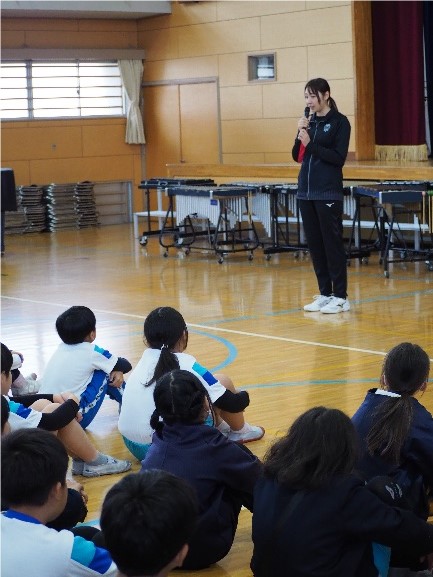 さらに、昨年度現役を引退した荒谷栞さん(現・株式会社姫路ヴィクトリーナ アカデミー事業部スタッフ)が避難方法の実演に参加し、最後には自身の経験を交えた防災の大切さについて語りました。スポーツチームと地域が連携することで、子どもたちにとって防災を身近に感じられる貴重な機会となり、災害時に自分の命を守る行動を考えるきっかけとなりました。