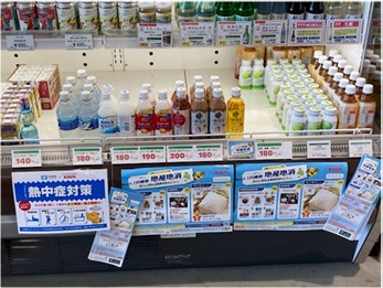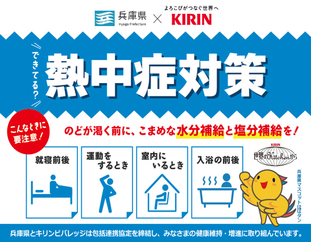 兵庫県はキリンビバレッジ株式会社と連携し、熱中症対策の啓発ポスターの作成と、県内の直売所や量販店などの小売店舗でポスターの掲示を行いました。熱中症が増加する夏季に合わせて、各売り場などで展開し、県民の皆さまへこまめな水分補給と塩分補給の必要性について注意喚起を実施しました。今後も企業と協力し、熱中症を防ぐ取組を進めていきます。