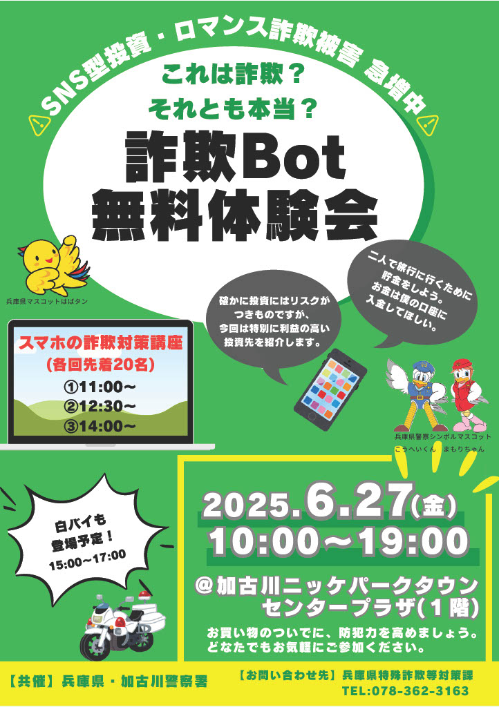 兵庫県・兵庫県警察本部・各警察署・ソフトバンク株式会社が連携し、ソフトバンク株式会社の開発した生成AI活用の仮想体験ツールを通じて、実際の詐欺被害プロセスを疑似体験する詐欺Bot体験会を昨年度に引き続き実施しました。