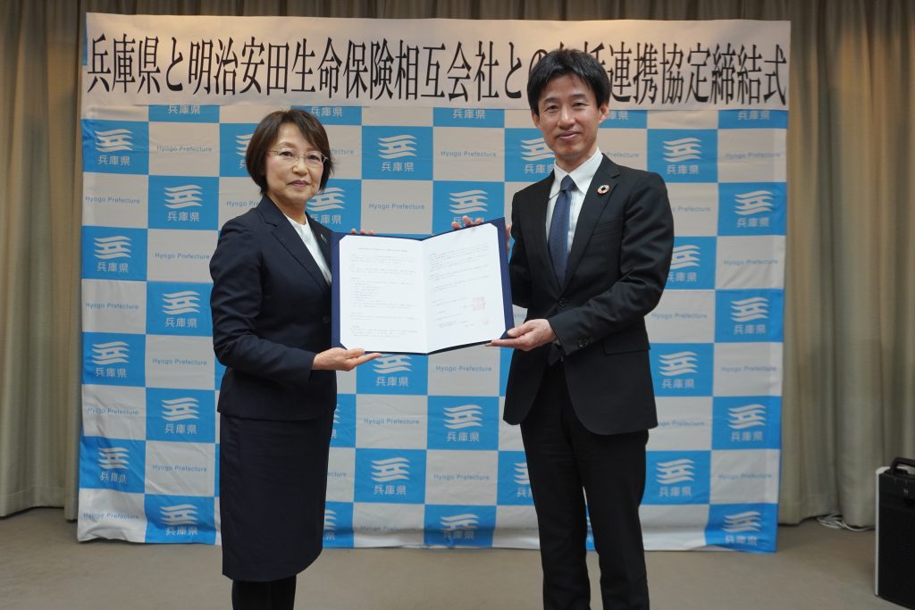 兵庫県は、健康サポート、地域活性化の取組で自治体連携を全国で幅広く展開する明治安田生命保険相互会社と包括連携協定を締結しました。今後は、県民の健康づくりのサポート、出会い支援事業への支援、公民連携によるSDGs普及啓発の支援などに連携して取り組んでいきます。